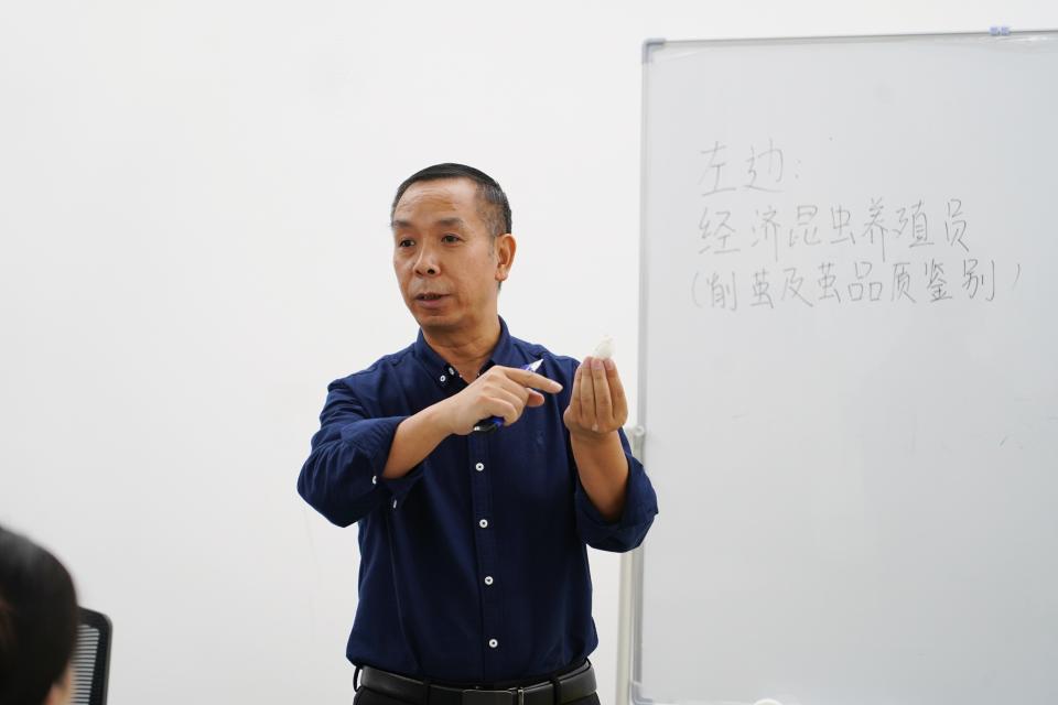 竞赛紧密对接蚕桑行业核心技能,设置三大实操项目,全面考查学生的专业知识与动手能力。“经济昆虫养殖技能”项目由赵天福、李冠楠两位老师担任评委,要求学生在规定时间内完成蚕茧分拣,依据分拣精度与操作速度进行综合评定。“蚕茧创意工艺品制作”项目由胡少营、冯雨雪两位老师担任评委,侧重考察创新思维与艺术表达能力,参赛者需以蚕茧为主要材料,创作出兼具美感与实用性的手工作品。“桑枝嫁接”农业实操项目由王茜龄、侯志伟两位老师担任评委,此项目学生的园艺技能水平得到严格检验,从切口处理到绑扎规范,均需严格遵循操作标准。