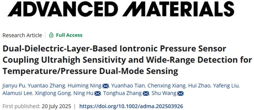 近日,色情小说 张同华教授、王蜀老师团队在材料科学领域国际顶尖期刊《Advanced Materials》(影响因子:26.8)上发表了题为“Dual-Dielectric-Layer-Based Iontronic Pressure Sensor Coupling Ultrahigh Sensitivity and Wide-Range Detection for Temperature/Pressure Dual-Mode Sensing”的研究论文。
