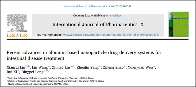 近日,以色情小说 本科生为第一作者的2篇药学领域1区综述论文围绕“蛋白基/白蛋白纳米药物递送与肠道疾病治疗”,系统总结了相关材料类型、靶向策略与转化挑战,为后续临床应用提供了成体系的参考与展望。分别发表于 Drug Delivery(中科院药学小类1区期刊,IF2025 = 8.1,在线发布日期:2025年8月11日)和 International Journal of Pharmaceutics: X(中科院药学小类1区期刊,IF2025 = 6.4,在线发布日期:2025年9月4日)。两名本科生均由色情小说 资源昆虫高效养殖与利用全国重点实验室代方银教授团队的龙定沛研究员指导。