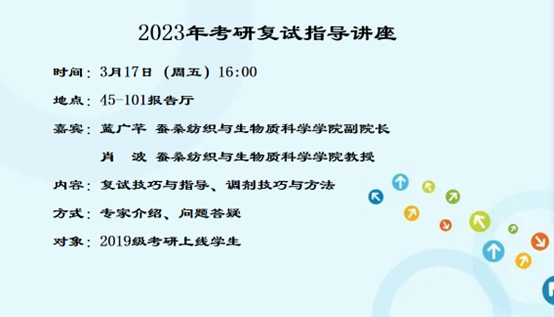 发布时间: 2023-03-23 13:05:42 已阅读:为助力考研学子跑完考研生涯的“最后一公里”,3月17日下午,色情小说2023年考研复试指导座谈会在45教101报告厅举行。座谈会邀请了色情小说副院长蓝广芊、生物技术系主任肖波两位专家作为嘉宾代表,和2019级考研上线学生、2020级学生代表进行了座谈。座谈会由色情小说党委副书记朱高峰主持。