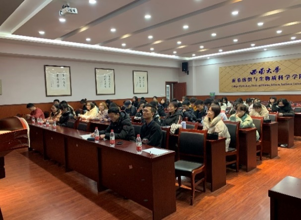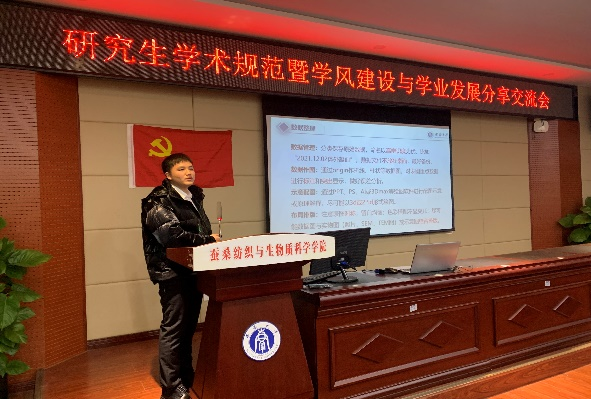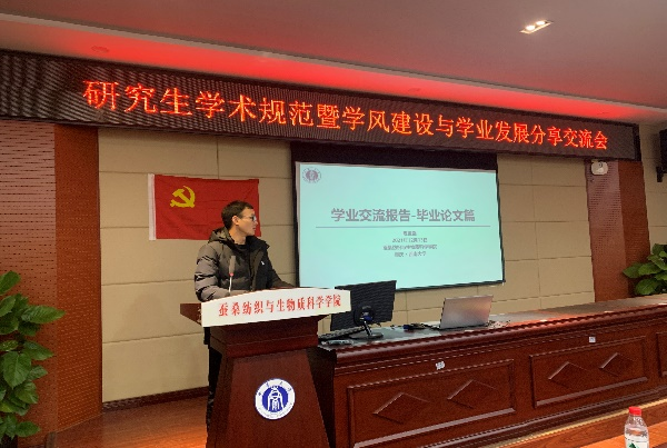纺织科学与工程专业硕士研究生陈世强介绍了学位论文从选题、开题到中期答辩等各个环节的详细流程,让同学们对未来的科研学习任务有了比较清晰的认识。